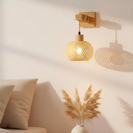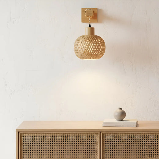 Applique murale bois style rotin naturel globe tressé ambiance bohème scandinave lumière douce.
