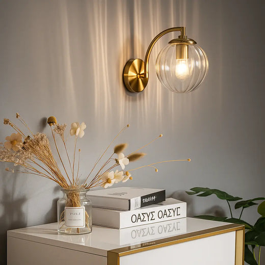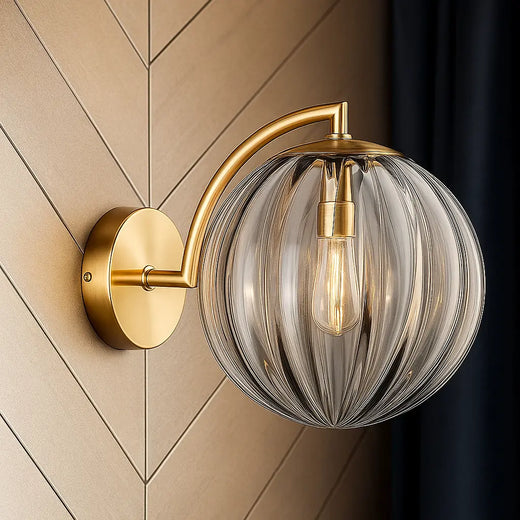 Fabriquée à partir de matériaux de qualité supérieure, cette applique présente une finition en laiton doré et un globule en verre nervuré, garantissant une allure haut de gamme. Disponible en plusieurs coloris – clair, ambre et café – elle s'adapte facilement à votre style intérieur. Ces variations de teintes permettent de créer différentes ambiances : optez pour un effet chaleureux avec l'ambre ou une esthétique plus moderne avec le verre fumé.